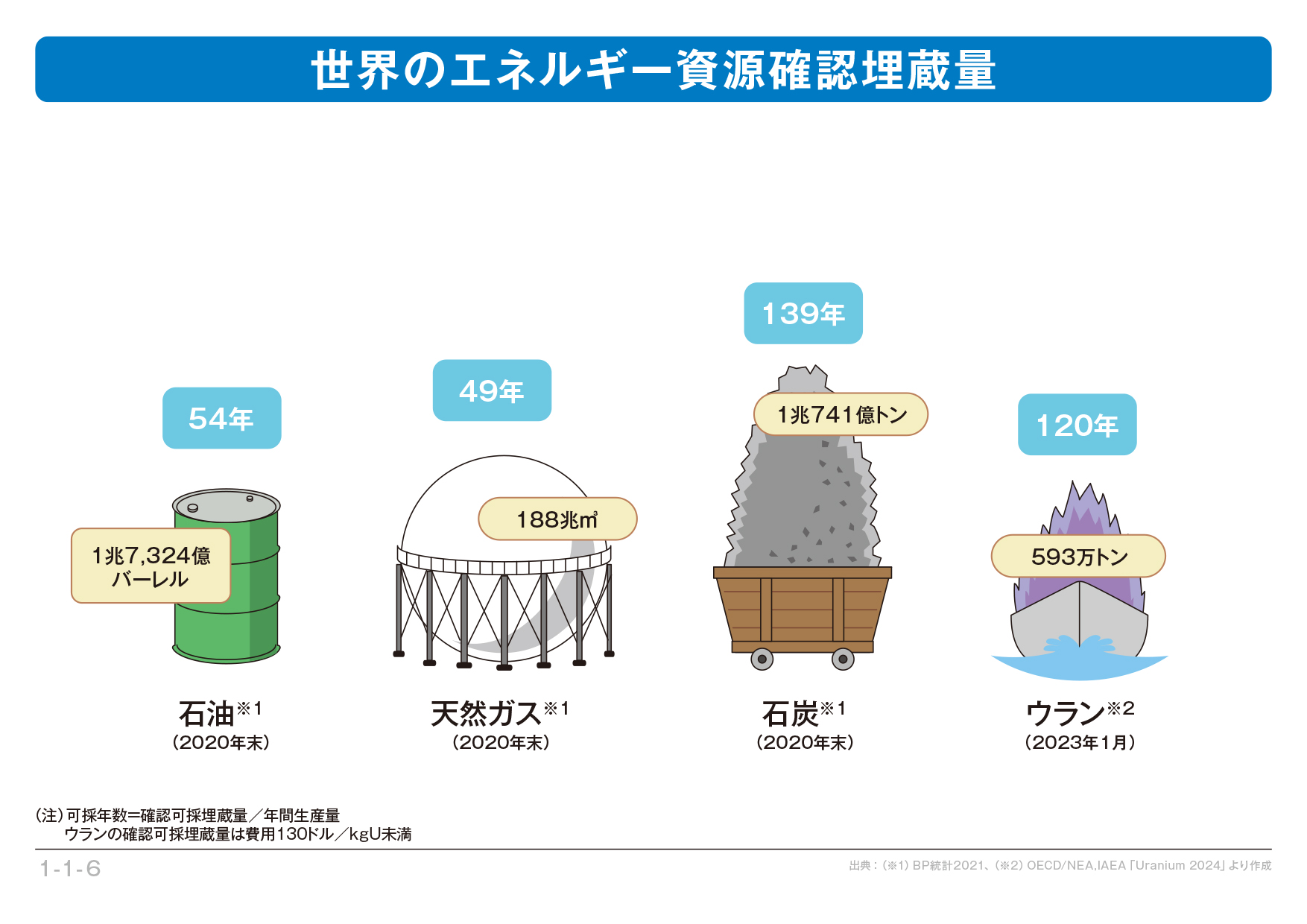 原子力・エネルギー図面集 ホーム > 原子力・エネルギー図面集 > 第1章 世界および日本のエネルギー情勢 > 【1-1-06】 世界のエネルギー資源確認埋蔵量 【1-1-06】 世界のエネルギー資源確認埋蔵量 エネルギー資源には限りがあり、今後のエネルギー消費の増大を考慮すると、その確保が厳しい状況にある。このため、省資源、省エネルギーに心がけることが重要となっている。(2025年10月30日更新) PDF(0.4MB)をダウンロード XLSX(0.03MB)をダウンロード JPG(0.1MB)をダウンロード 解説動画 近畿大学 理工学部電気電子工学科教授 渥美 寿雄 先生 #上善如水(老子) #明鏡止水(荘子) #行雲流水(蘇軾) 根拠データ BP統計2021 OECD Uranium2022 関連情報(詳細) 原子力総合パンフレットWEB版 専門情報 資源エネルギー庁 エネルギー白書2023 活用事例 『マイナビニュース』 (株式会社マイナビ) この記事に登録されたタグ ◆解説動画あり 関連記事 【1-1-07】 世界の一次エネルギー消費量の推移【1-1-08】 主要国の一次エネルギー構成【1-2-03】 日本の一次エネルギー供給実績【1-2-09】 一次エネルギーに占める電力の比率 (電力化率) Copyright(C) Japan Atomic Energy Relations Organization All Rights Reserved.