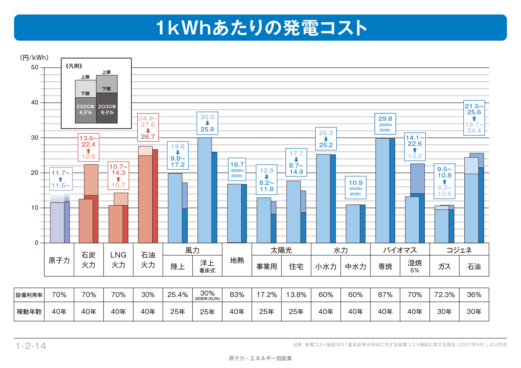 石炭火力やLNG火力のコストは、CO₂対策費用や燃料費上昇を加味するとコスト高になる。 また、風力、太陽光は、系統安定化などの課題がありコスト高になる。 原子力発電の発電コストは、燃料費の割合が小さいため、燃料価格に左右されにくい特徴があるが、事故のリスクを踏まえると社会的な費用の発生が存在する。(2022年2月16日更新)