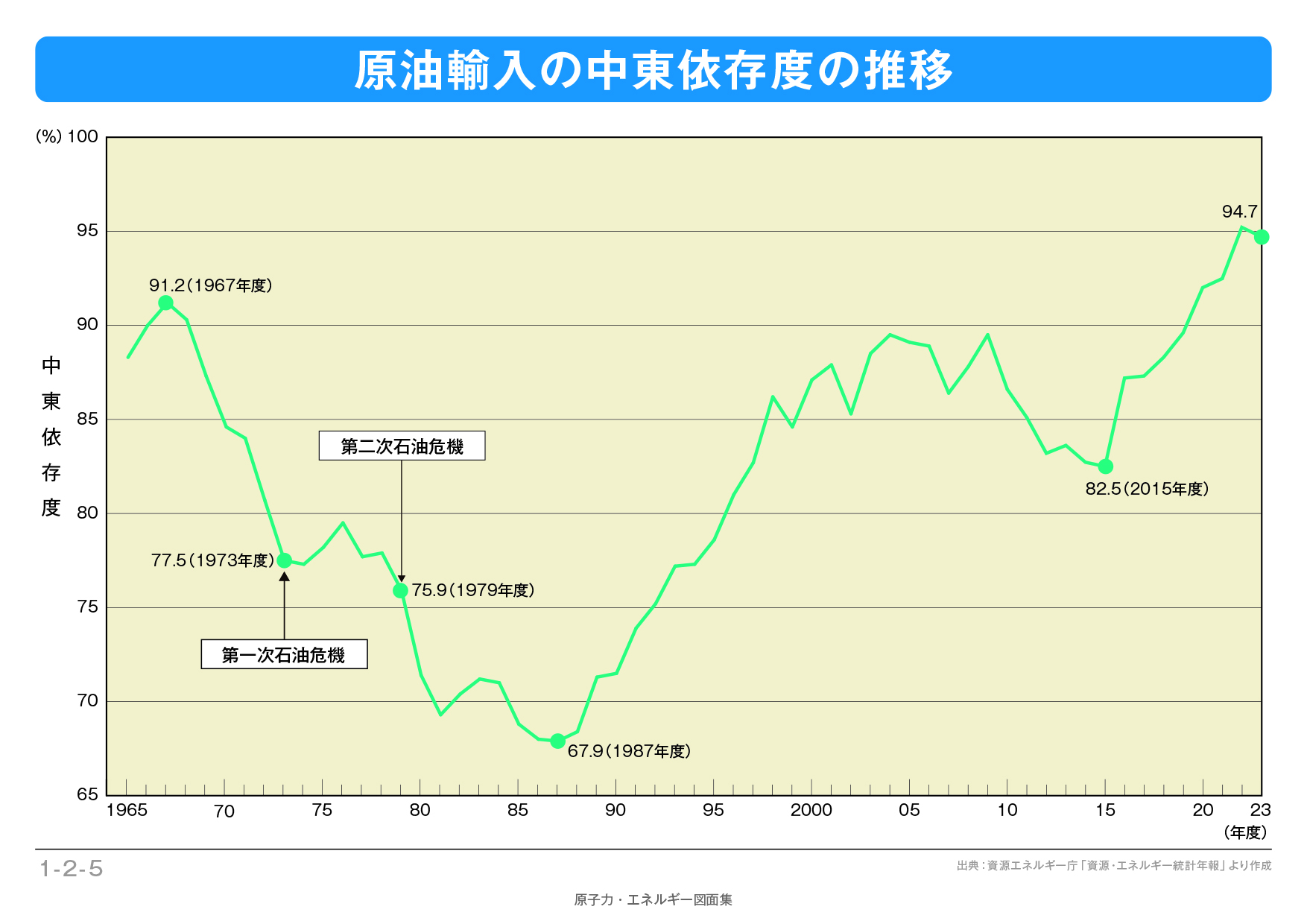 日本の原油輸入の中東依存度は一時67.9%まで低下したが、最近では石油危機以前の水準に戻っている。(2025年10月7日更新)