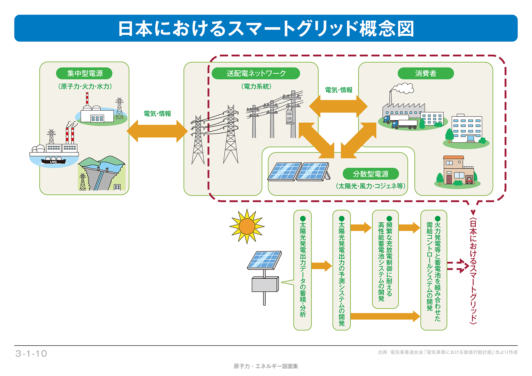 原子力・火力・水力といった既存の集中型電源と送電系統の一体運用に、情報技術(IT)を組み合わせ、分散型電源である太陽光発電等の再生可能エネルギーを統合、活用して行う電力供給システムのこと。(2016年3月14日更新)