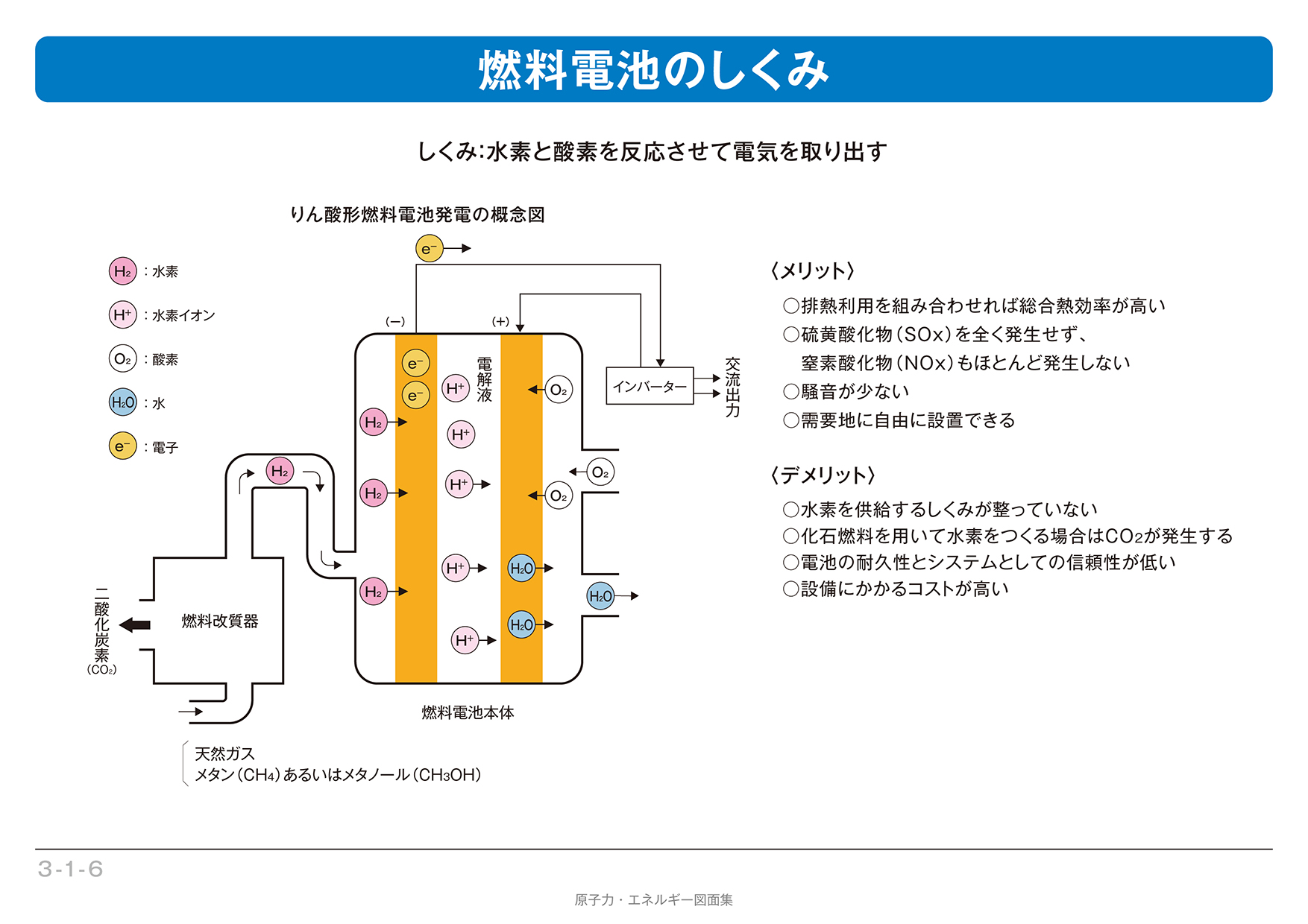 水素と酸素を反応させて電気を取り出す燃料電池は、総合熱効率が高い等のメリットも多いが、水素を作るために化石燃料を用いた場合にはCO₂が発生するという問題点もある。(2016年3月14日更新)