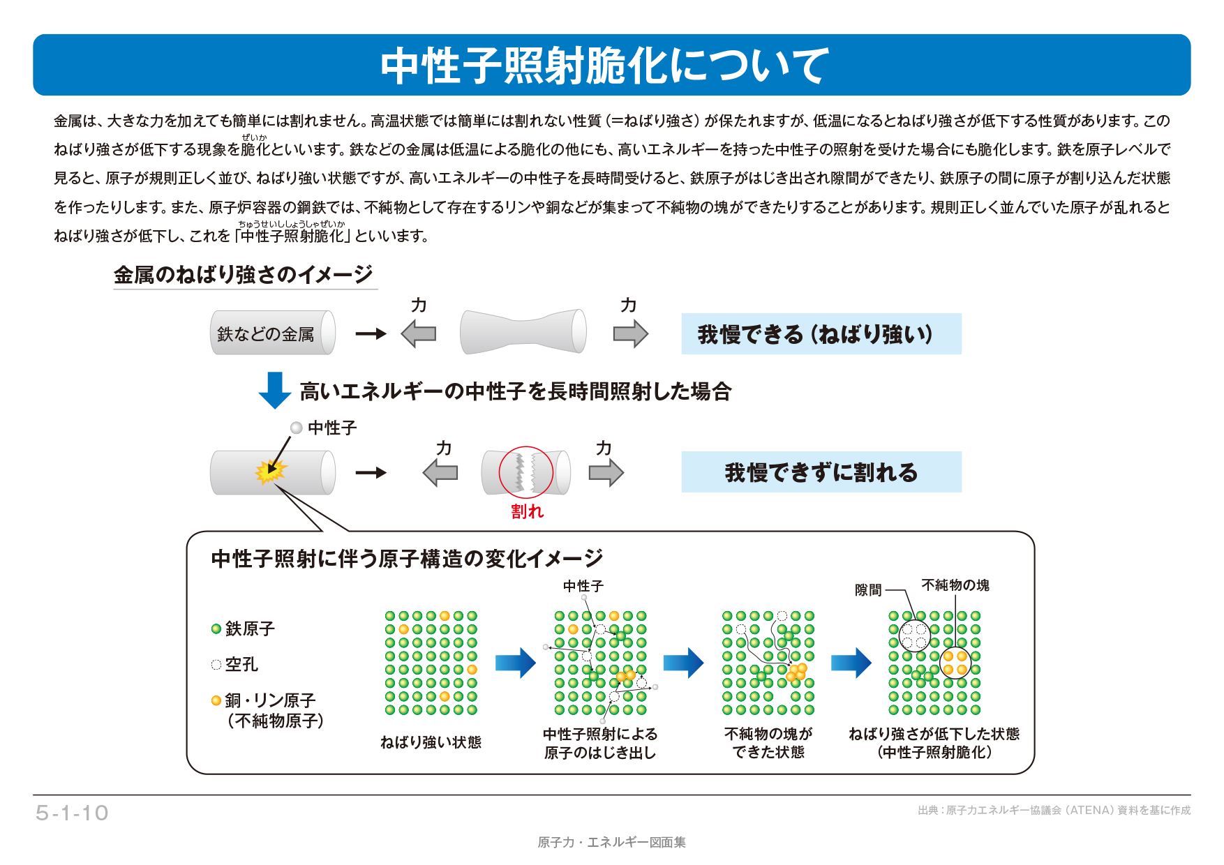 金属は、大きな力を加えても簡単には割れません。高温状態では簡単には割れない性質(=ねばり強さ)が保たれますが、低温になるとねばり強さが低下する性質があります。このねばり強さが低下する現象を脆化といいます。鉄などの金属は低温による脆化にも、高いエネルギーを持った中性子の照射を受けた場合にも脆化します。(2024年3月21日更新)