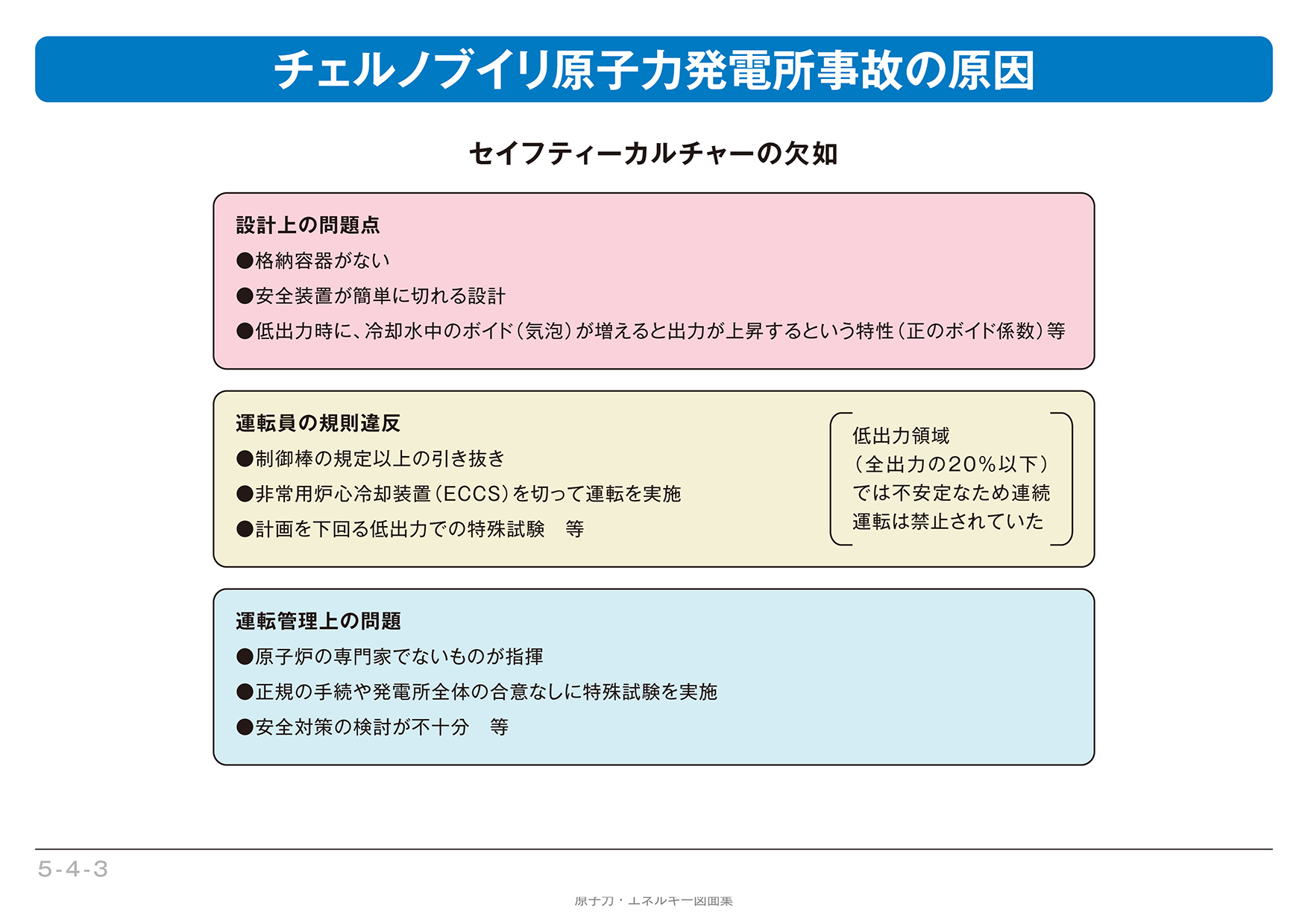 チェルノブイリ原子力発電所は、設計上の問題点や運転員の規則違反、運転管理上の問題が重なって発生した。これらの問題の根底には、セイフティーカルチャー(原子力に関わるすべての個人や組織が常に安全に関する意識を最優先して行動すべきであるとする考え方)の欠如があったと考えられている。(2016年3月14日更新)