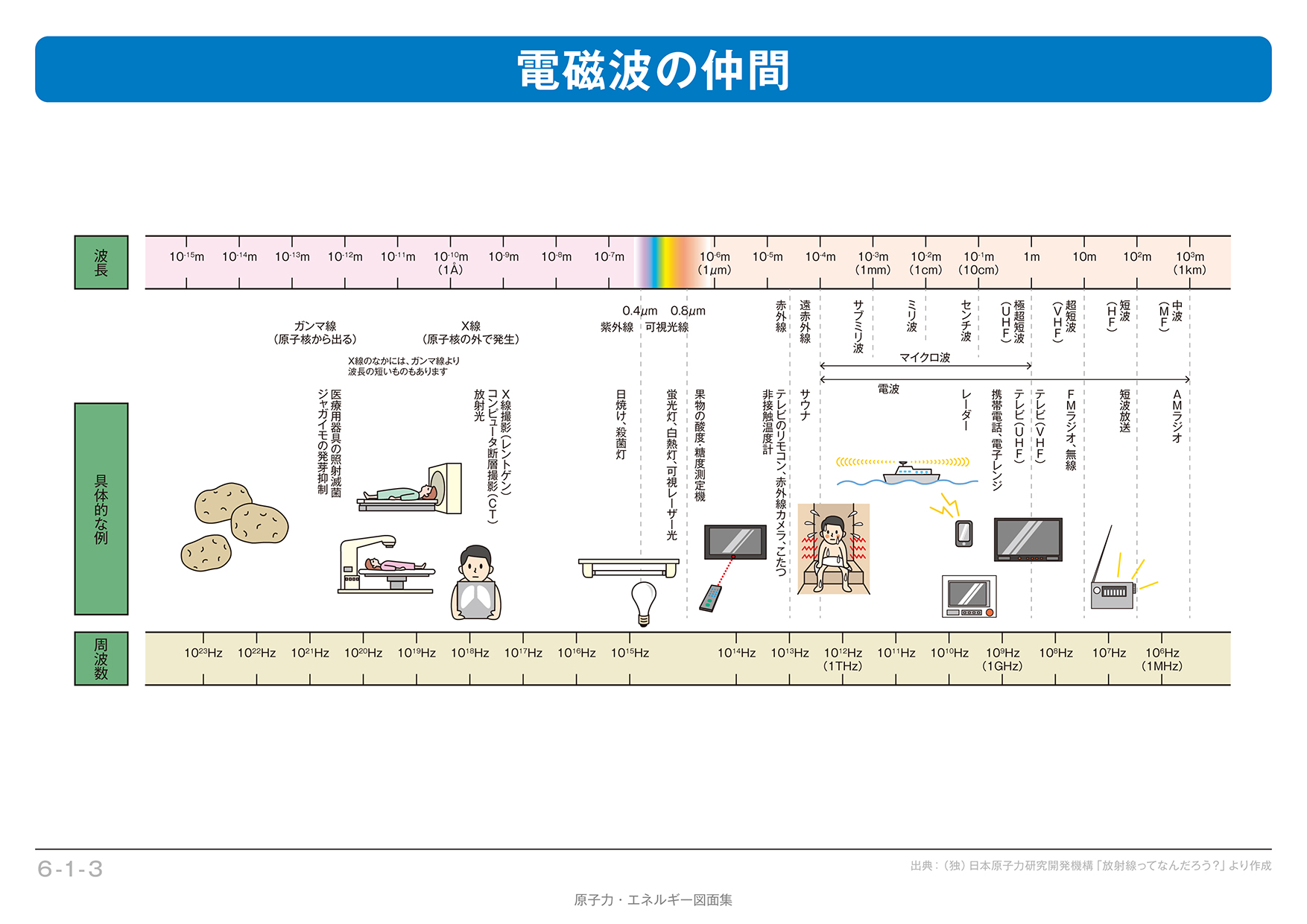 電磁波には、テレビやラジオの放送に使われる電波や紫外線、赤外線等も含まれる。レントゲン撮影に使われるエックス線や放射線も電磁波の仲間である。なお、電波は、エックス線などと比較すると周波数がきわめて低くエネルギーも小さいため、非電離放射線(物質の原子を電離させることができない電磁波)の仲間になる。(2016年3月14日更新)