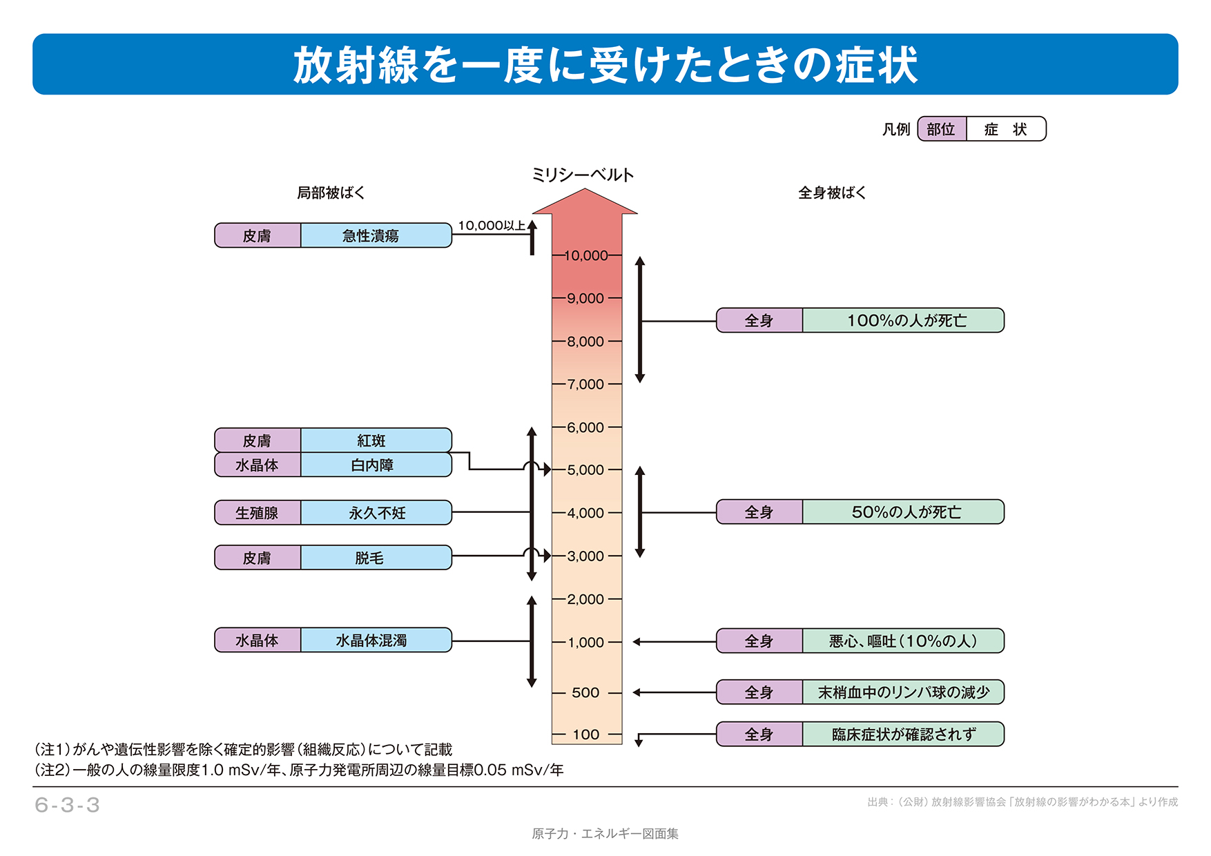 放射線を受けると、細胞内の染色体内にあるDNAが損傷を受けるが、人体は損傷を修復する機能を備えているので、放射線量が少ない場合は、ほとんど影響がない。しかし、一度に受けた放射線量が多い場合は修復が間に合わず、変化する細胞も多く障害が現れるため、最悪の場合には死亡してしまう。なお、100ミリシーベルト以下の放射線を一度に全身に受けても、確定的影響(組織反応)は見られない。(2016年3月14日更新)