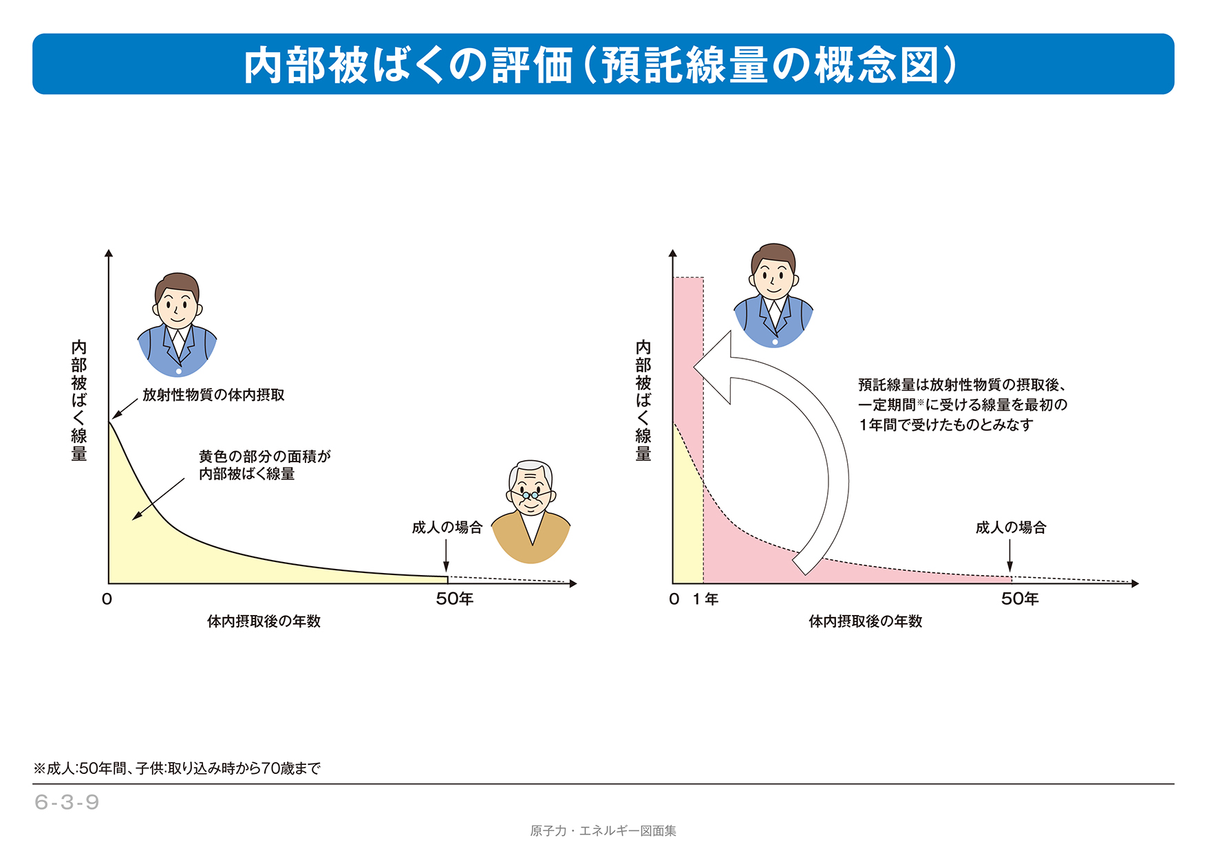 放射性物質を体内に取り込んだ後に、内部被ばくを与え続ける放射線の実効線量を、一定期間にわたって積算した値を預託実効線量という。一定期間としては、成人については50年間、子どもについては取り込み時から70歳までの期間が採用されている。なお、体内に取り込まれた放射性物質は、時間が経つにつれて放射能が減衰するとともに、代謝機能により体内から徐々に排せつされる。(2016年3月14日更新)