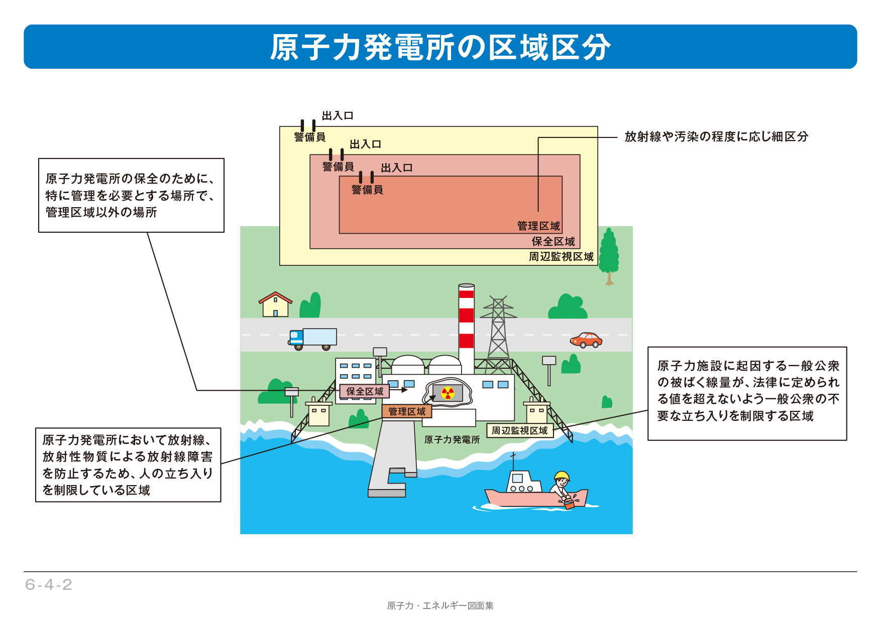 原子力施設では施設エリアを目的別に大きく3つに区域区分している。 「管理区域」は原子力施設において放射線、放射性物質による放射線障害を防止するため人の出入りを制限している区域、「保全区域」は放射線の管理は必要としないが施設の保全を必要とする場所で管理区域以外の区域、「周辺監視区域」は原子力施設に起因する一般公衆の被ばく線量を法令に定める値を超えないよう一般の方々の不要な立ち入りを制限する区域である。(2021年1月6日更新)