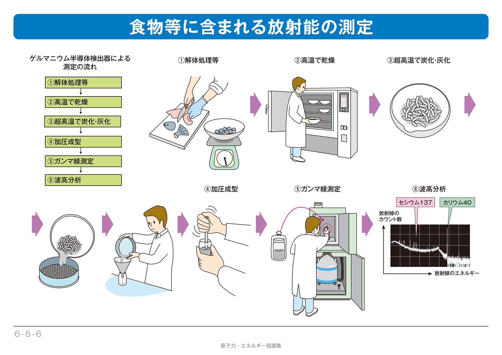 手順は、まず、放射能を測定する食品等を測定しやすいよう前処理(解体、炭化、灰化、濃縮等)を行う。その後試料を周囲の放射線を遮へいするため鉛容器におさめられた検出器の上に直接乗せて測定。