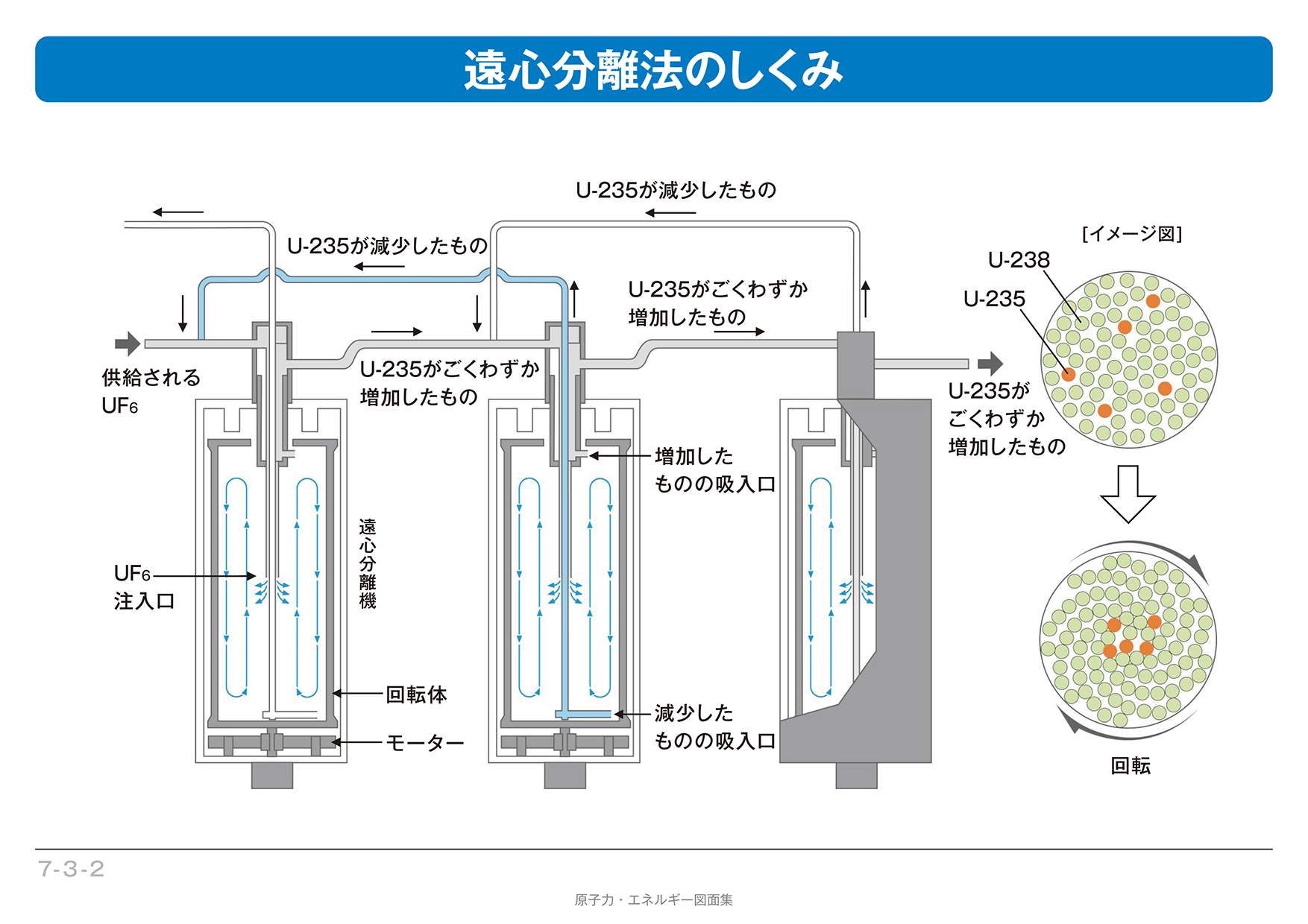 ウラン濃縮に用いられる方法の一種で、遠心分離機を使ってウラン235の濃縮度を上げる方法を遠心分離法という。気体状態の六フッ化ウラン(UF₆)を、高速回転中の遠心分離機に入れると、遠心力により重いウラン238が外側に、軽いウラン235が内側に分離される。ガス拡散法に比べ消費電力が少なく、比較的小規模の工場でも経済性が得られる等利点が多い。(2016年3月14日更新)