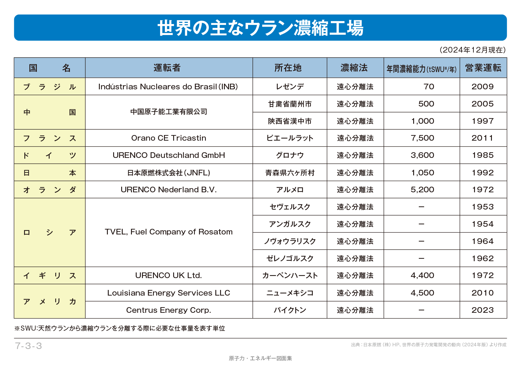 原子力・エネルギー図面集 ホーム > 原子力・エネルギー図面集 > 第7章 原子燃料サイクル > 【7-3-03】世界の主なウラン濃縮工場 【7-3-03】世界の主なウラン濃縮工場 現在はすべての国で遠心分離法が採用されている。(2025年5月30日更新) PDF(0.4MB)をダウンロード JPG(0.2MB)をダウンロード この記事に登録されたタグ 関連記事 【7-3-01】世界の主なウラン転換工場【7-3-04】世界の主なウラン再転換工場 【7-3-06】世界の主なウラン燃料加工工場(軽水炉燃料) Copyright(C) Japan Atomic Energy Relations Organization All Rights Reserved.