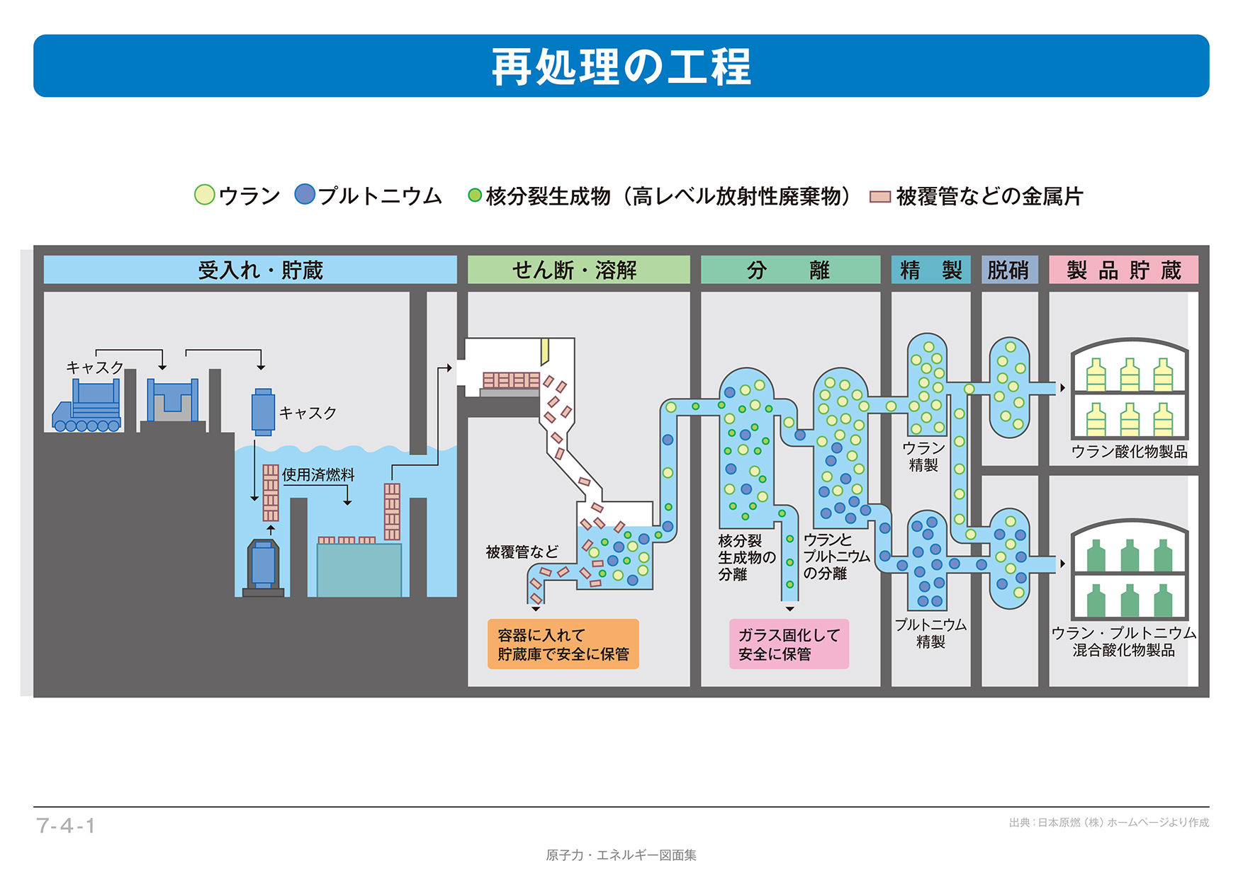 使用済燃料は放射能を弱めるため、貯蔵プールに冷却・貯蔵される。その後、十分に放射能が弱まった後、約3~4cmの長さに細かくせん断し、燃料の部分を硝酸で溶かし、ウラン、プルトニウム、核分裂生成物に分離する。ウラン溶液とプルトニウム溶液は、精製、脱硝してウラン酸化物とウラン・プルトニウム混合酸化物になる。核分裂生成物を含む廃液は、強い放射能を帯びているため、ガラス原料と混ぜ合わせガラス固化体にされる。(2018年6月27日更新)