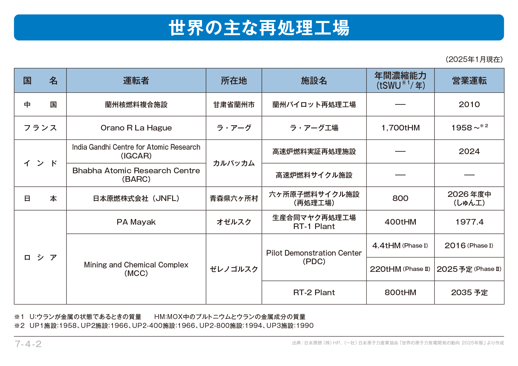 日本は、これまでイギリスとフランスに再処理を委託してきたが、国内再処理を行うため青森県六ヶ所村に年間800トンの処理能力をもつ再処理工場を建設しており、しゅん工予定を2026年度中としている。(2025年8月19日更新)