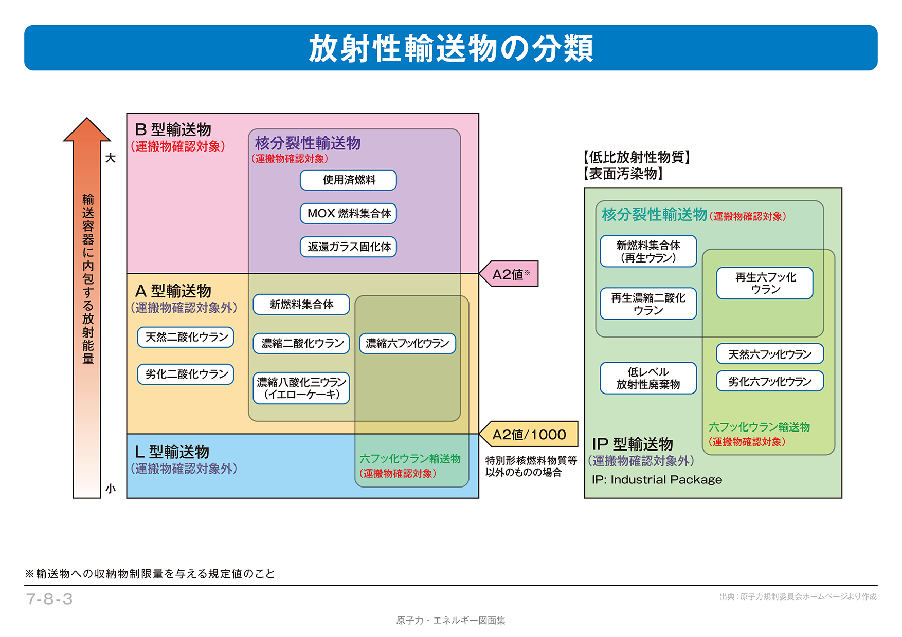 核燃料物質または核燃料物質により汚染されたもの(核燃料物質等)が収容された容器を核燃料輸送物という。収納される放射能量等により、L型輸送物、A型輸送物、B型輸送物等に区分されるが、放射性物質の放射能が一定量を超えないもの(低比放射性物質)および核燃料物質によって表面が汚染されたもの(表面汚染物)を収納する輸送物は、IP型輸送物と呼ばれる。また、臨界安全性の確保が必要な輸送物は核分裂性輸送物として扱われる。(2016年3月14日更新)