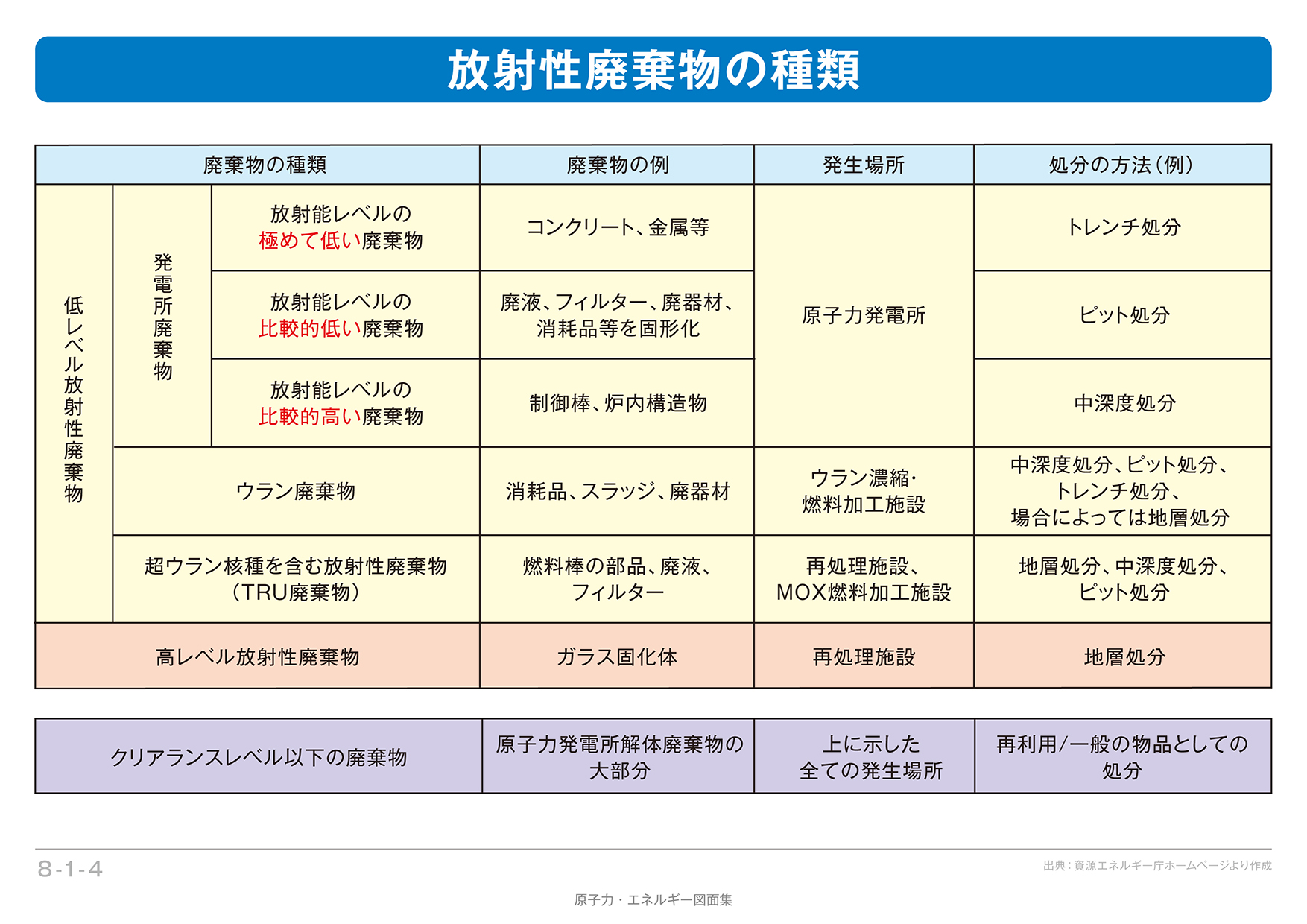 放射性廃棄物は、高レベル放射性廃棄物(使用済燃料からウラン・プルトニウムを回収した後に残る核分裂生成物)と、それ以外の低レベル放射性廃棄物に大別される。それぞれの廃棄物はその放射能レベルに応じた処分が行われる。(2017年9月26日更新)